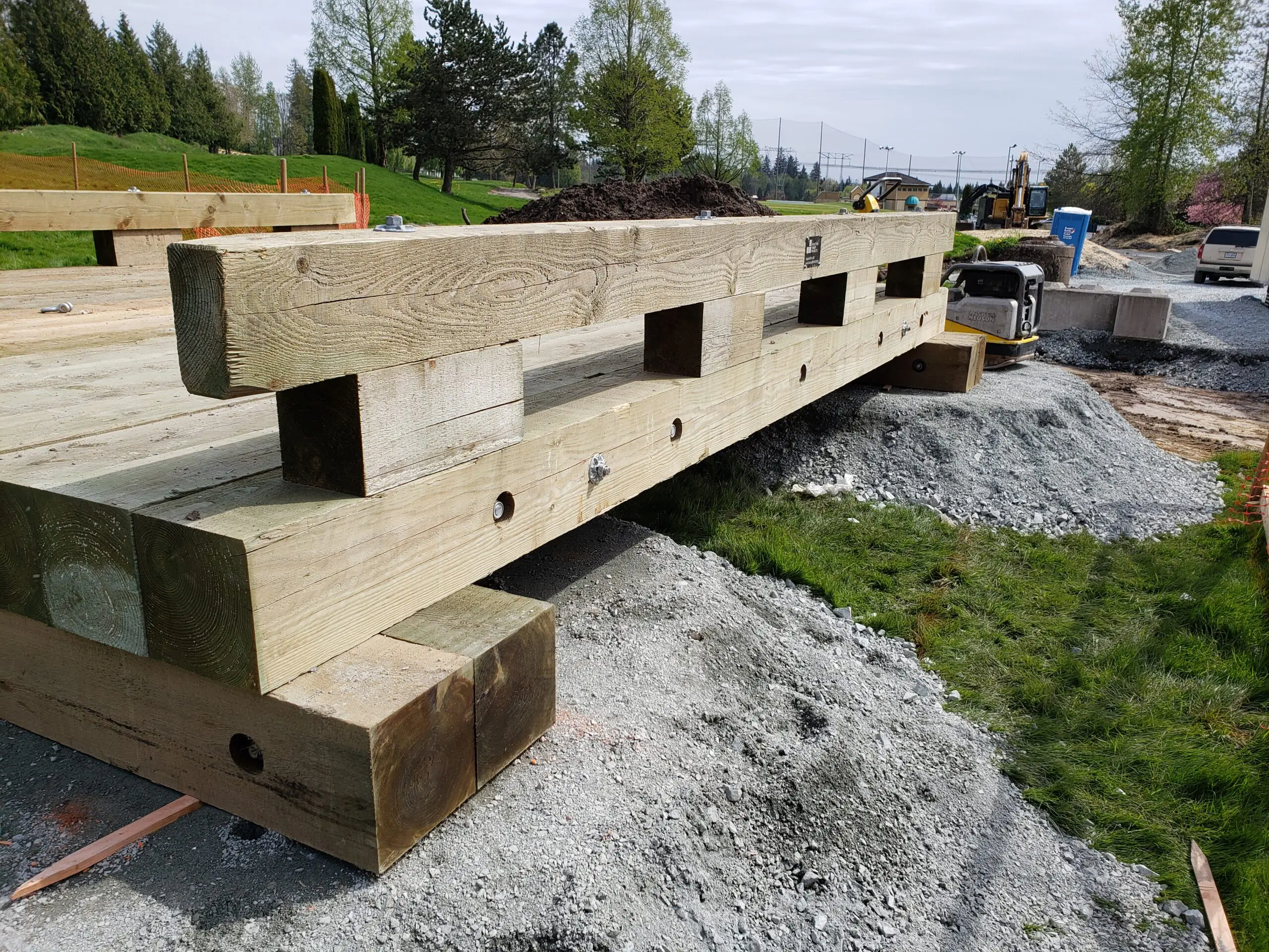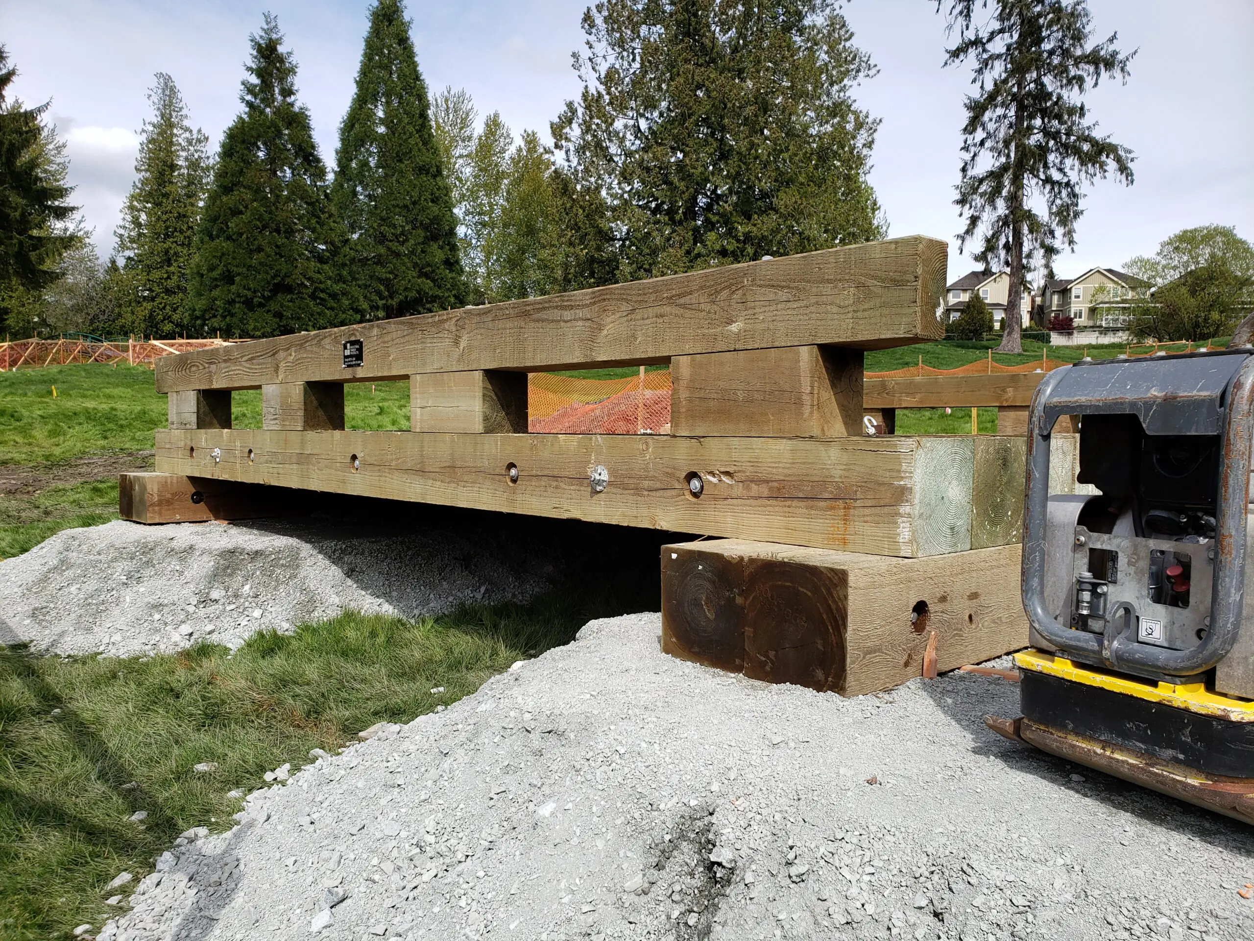 We supplied this bridge to a local contractor who needs to access the back end of a Golf Course in Surrey. The golf course is doing a housing development. All vehicles, from cement trucks to excavators to plumbers and electricians will access the site over this bridge. The bridge crosses a 15″ Fortis Gas Main-line. The support is 2 pads 12″ x 24″ x 20′ on compacted gravel abutments. Interesting project!