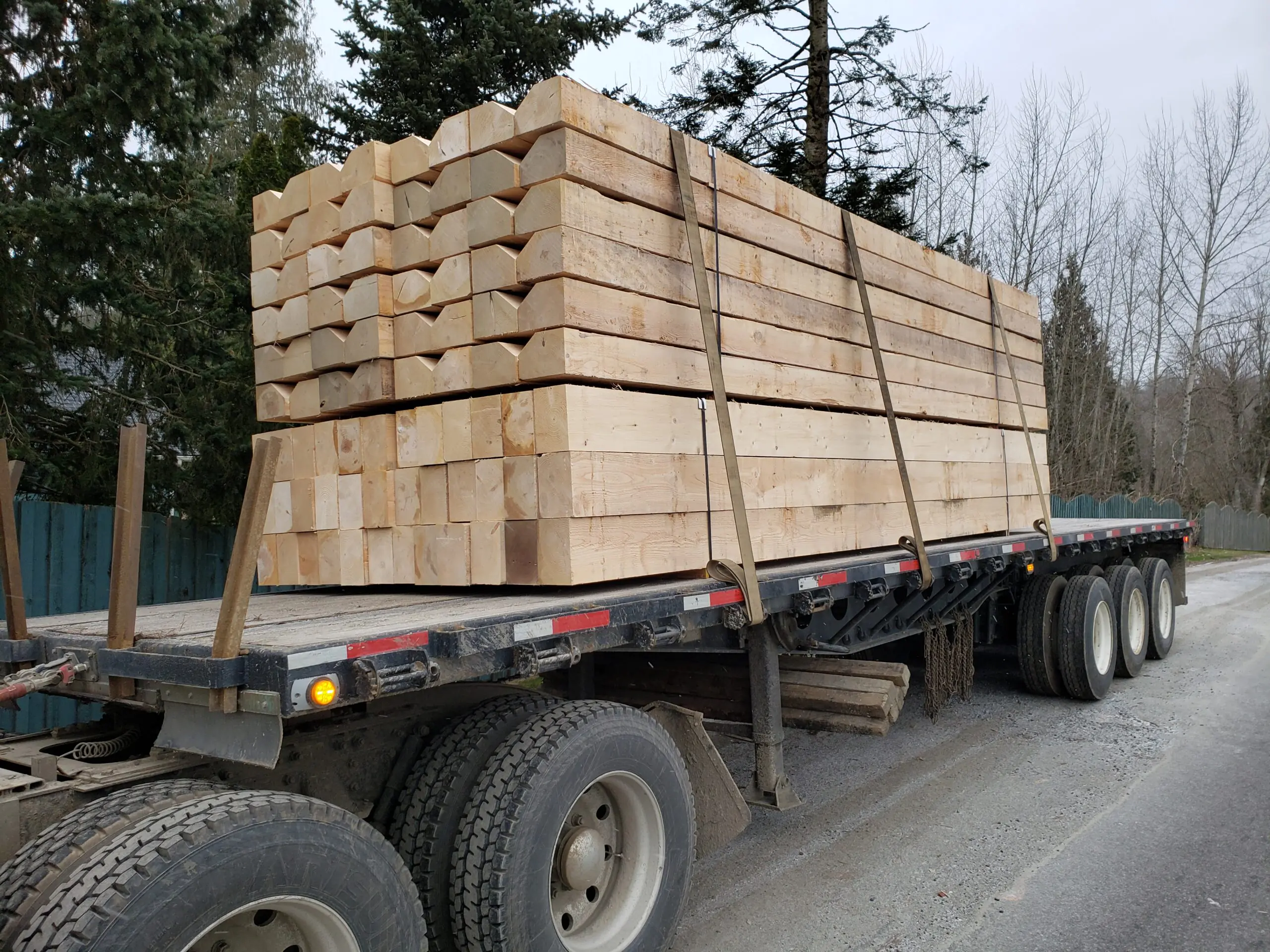 These rail crossing timbers are 7″ thickness x 10″ wide x 20′ long. You can see we custom saw the bottom triangle out of the pieces that are closest to the rail, so that they lay flat. Inside the “missing triangle” are the rail plates to hold down the rail. Different “weights” of rails have different thicknesses for Crossing Planks. We make 8″ thickness, 7″ thickness and 6″ thickness.