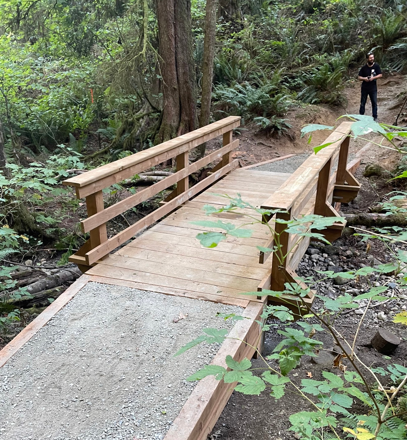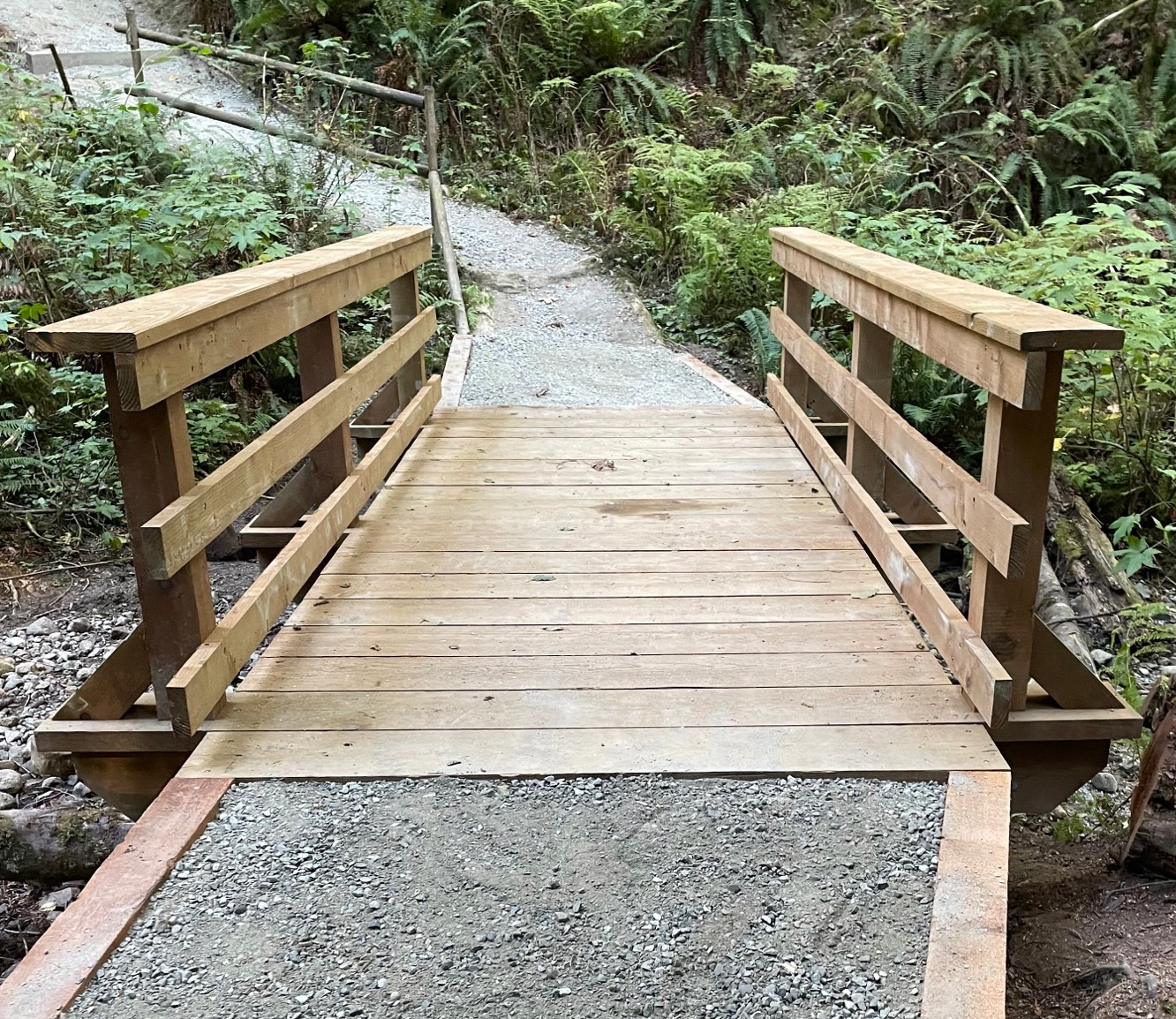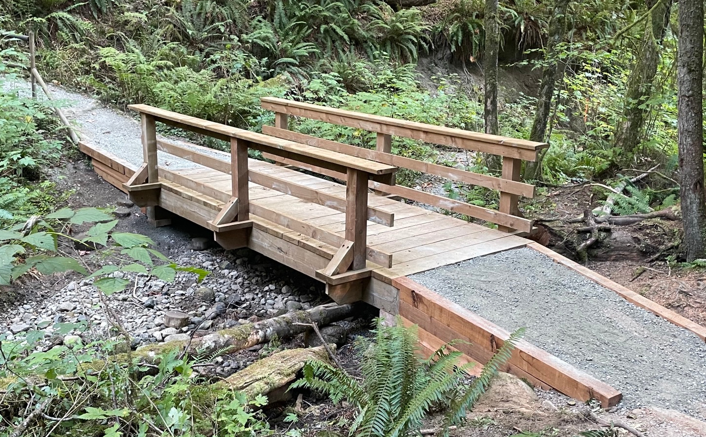 This nice little bridge was installed on a “hike in” trail with no road access. We supplied the parts as a kit, all cut to size, supplied with an instruction drawing. Our customer used a Ute vehicle (ATV with long wagon) to get the parts to the site. These are engineered for maximum 3000 lbs loading (any ATV/Motorbike/Golf Cart/Fat Horse etc). The bridge is intentionally made 7′ wide so no full size vehicles can cross it (overload). This is wheelchair accessible.